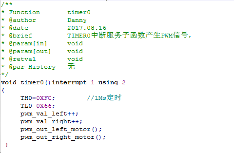 STC12C5A60S2系列单片机的PAC模块可以通过程序设定,使其工作于8位PWM模式。本次实验中我们是用定时器0开产生PWM控制电机,从而进一步控制小车的的运动。