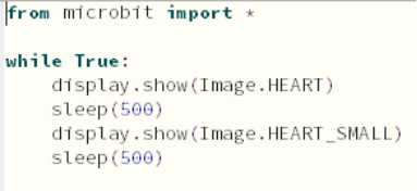 第二行的 display.show(image)意思在micro:bit点阵上显示一个内置图像,display也是一个类似于microbit的库,只是它被包含在了microbit里面。display.show的意思就是使用display这个库里面的show()函数,这个函数的作用是显示一个内置图像,而这个内置的图像就是(Image.HEART),一个心形图像,下面是一份内置图像的清单: