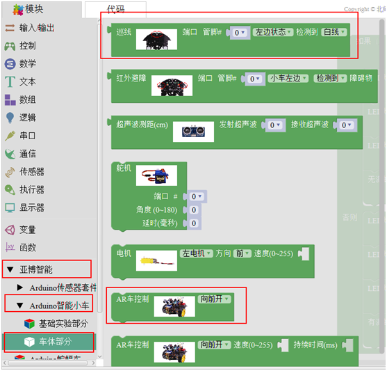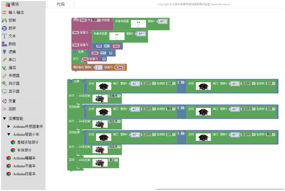 c、配置完成后,选择下图中上传按钮,等待下面框中提示 上传成功。当小车行驶了很长时间车身过热时(一般不会发生这样的情况)led就会亮起,这时我们就可以知道车身过热了。或者小车处于一个过热的环境,小车的led也会亮起,意味着小车旁边的环境热量过高。