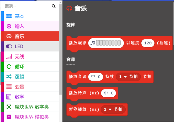 本次介绍的内容主要分为模块世界 数字类、魔块世界 观感类、魔块世界 PWM类、颜色识别、数码管,不同类型的积木的颜色是不一样的,因此大家在根据程序图查找对应积木块时,就可以通过积木块的颜色来快速定位查找。