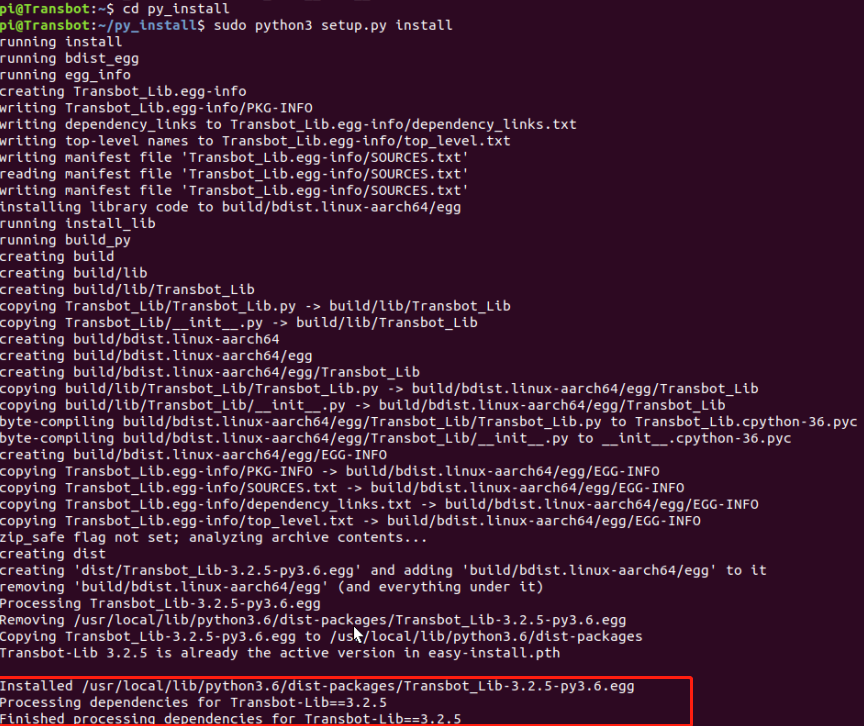 运行安装命令,看到最后提示的安装版本号则表示安装成功。此命令会覆盖掉之前已经安装过的Transbot_Lib驱动库。