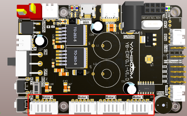 下图片中红色方框位置为电机MOTOR 1, MOTOR 2, MOTOR 3, MOTOR 4。电机接口具有防反接功能,使用Rosmaster的电机排线连接到电机即可。这里需要注意根据不同的车型连接电机,这里以麦克纳姆轮小车为例,MOTOR 1连接到小车的左前方电机,MOTOR 2连接到小车的左后方电机,MOTOR 3连接到小车的右前方电机,MOTOR 4连接到小车的右后方电机。