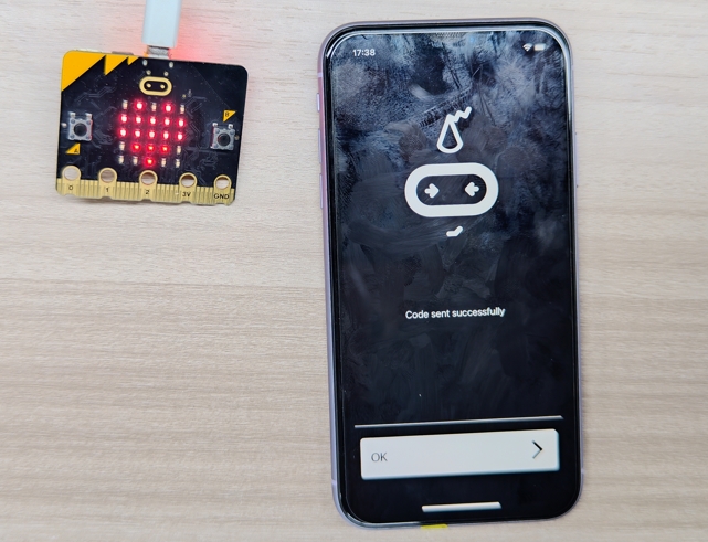 microbit主板显示爱心,App显示发送成功,手机点击ok