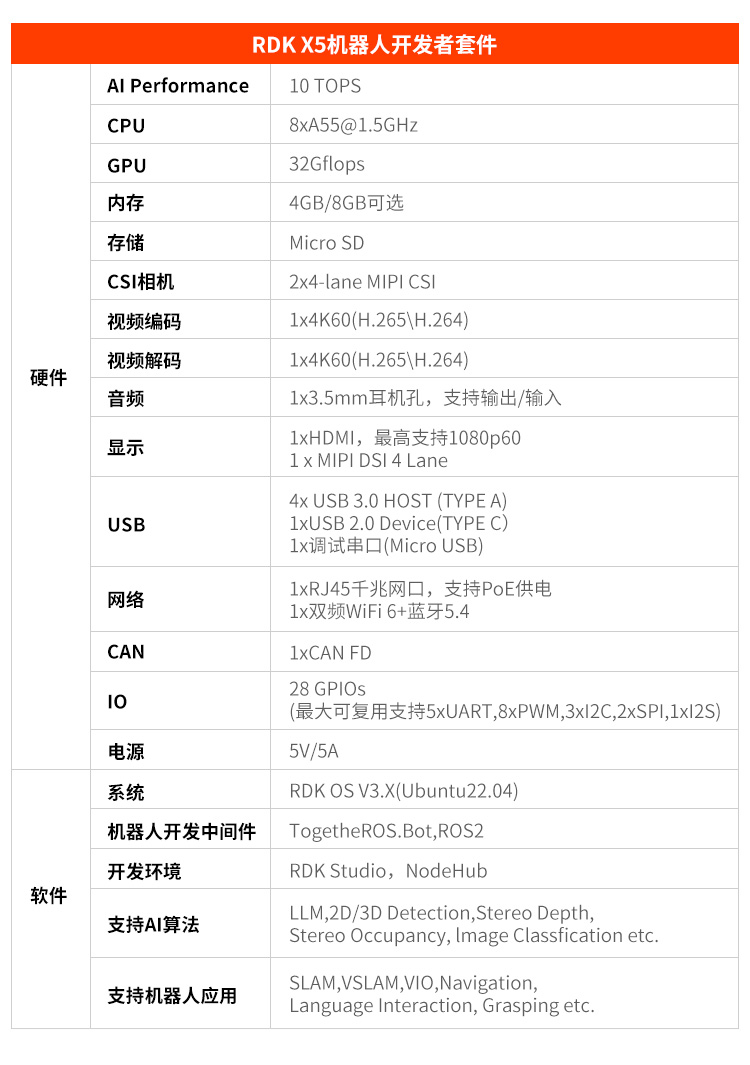 D-Robotics RDKX5搭载Sunrise5智能计算芯片,可提供高达10Tops的算力,是一款面向智能计算与机器人应用的全能开发套件,接口丰富,简单易用,支持Transfomer、RWKV、Occupancy、Stere0、Perception等多种复杂模型和最新算法,加速智能化应用快速落地。RDK X5 是一款全功能开发板,具有 10Tops 端侧推理算力与 8 核 ARM A55 处理能力,支持 2 路 MIPI Camera 接入,4 路 USB3.0 接口。通过搭配丰富的传感器和扩展组件,为开发者提供了灵活的硬件扩展和连接选项。