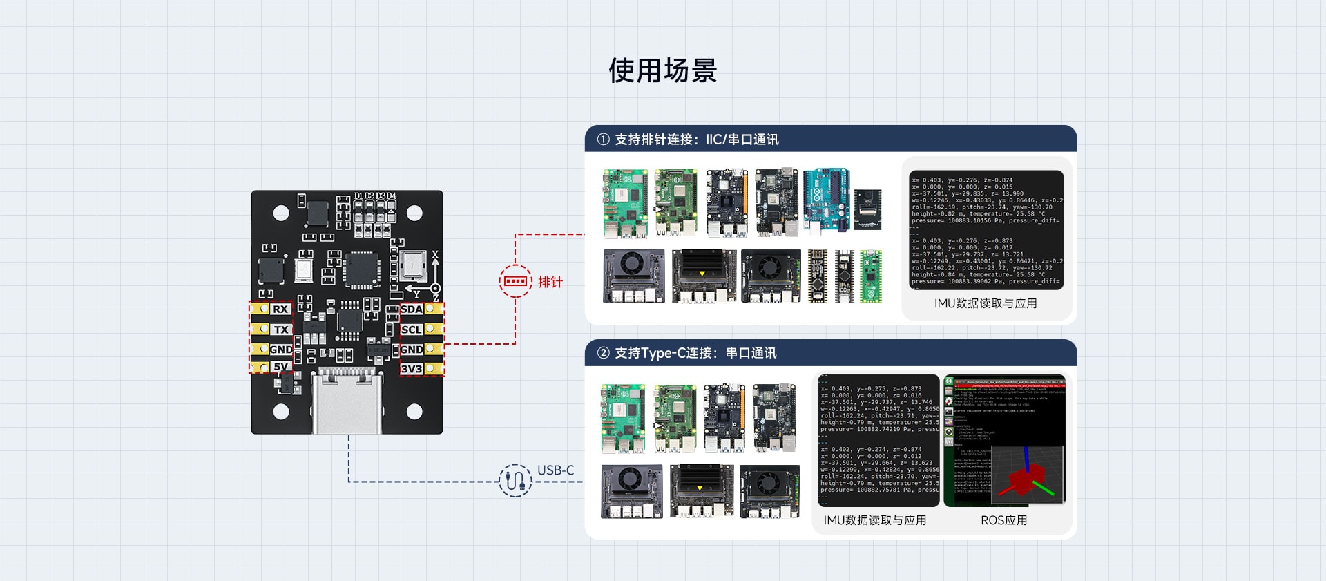 支持使用RVIZ展示IMU模块的数据,搭配ROS机器人操作系统展示图像化界面。