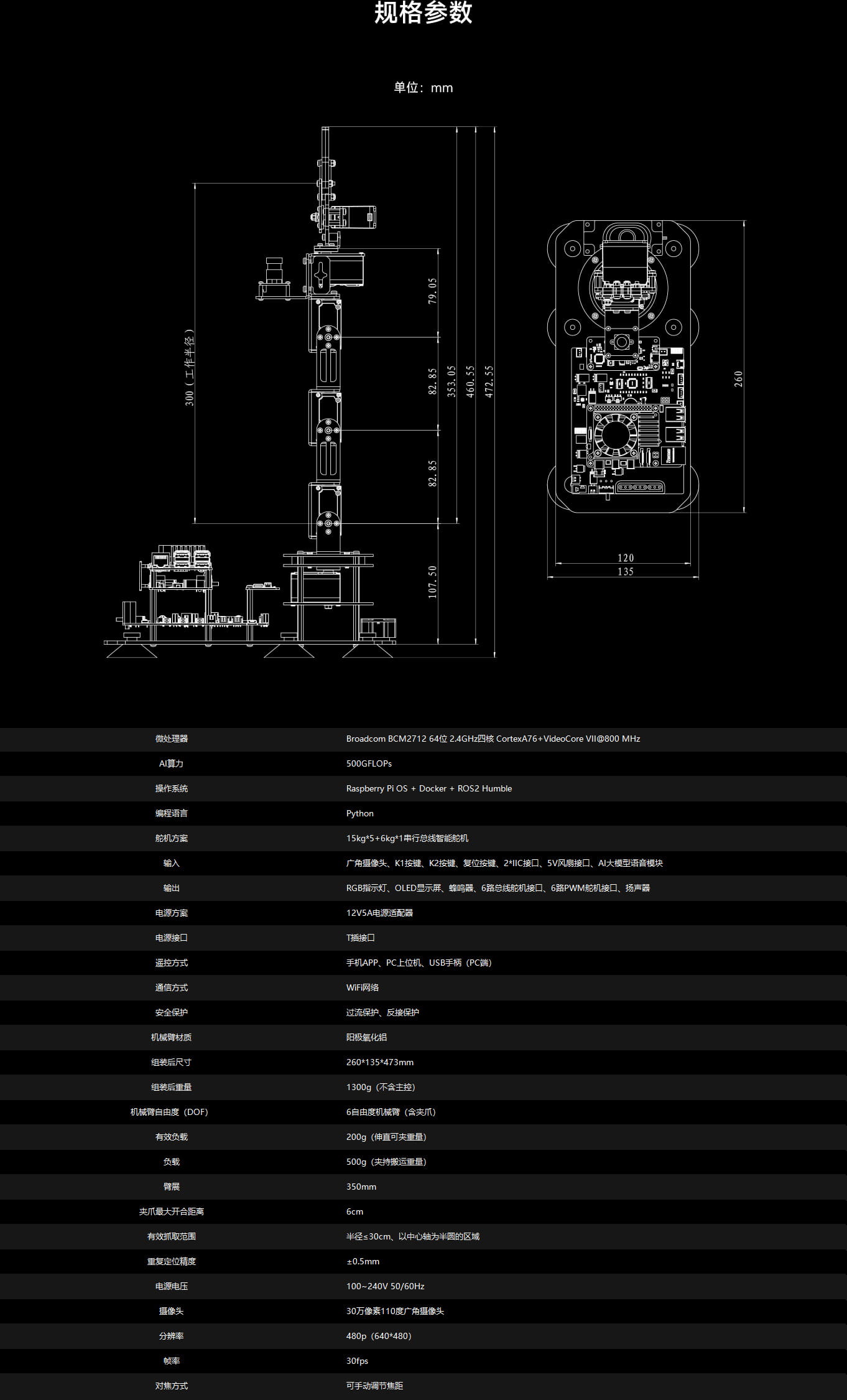 机械臂搭载的USB摄像头拥有30万像素、110度视场角、480p分辨率、30fps帧率,可以提供高质量的图像采集和灵活的焦距控制。