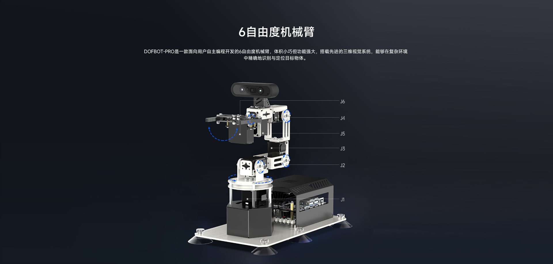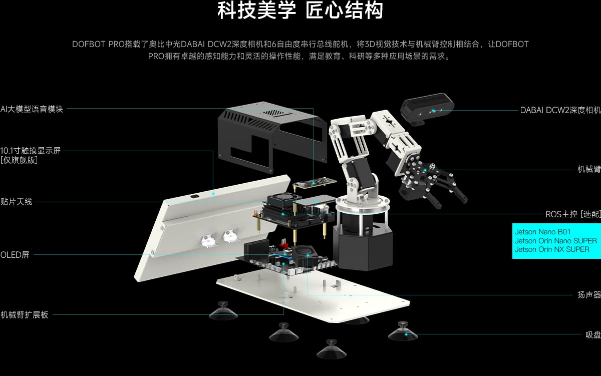 DOFBOT-PRO搭载深度相机,能够理解和分析图像内容,精准识别物体,并输出文本和语音反馈。
