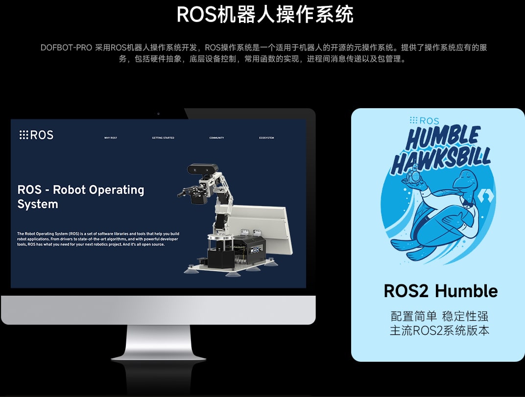 机械臂搭载10.1寸触摸显示屏,采用包裹式金属外壳设计,线材隐蔽处理,整体外观简洁美观。屏幕支持俯仰角度调节,方便ROS机器人开发和调试。