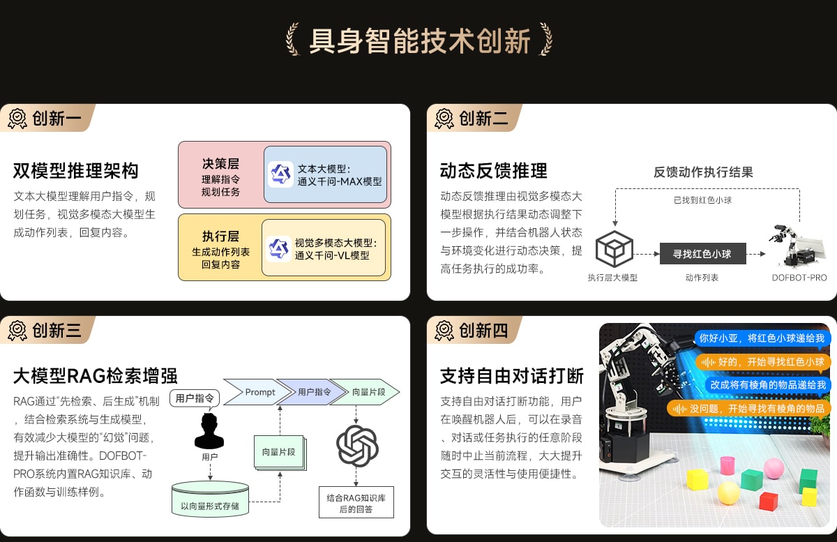 DOFBOT-PRO实时接入通义千问大模型平台,宛如配备"超级大脑",不仅能理解文本指令,还能灵活应答。
