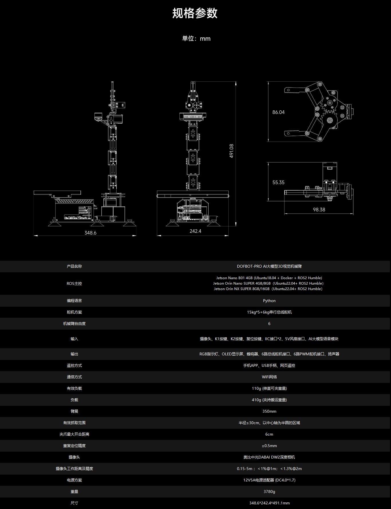 机械臂机身搭配5个15KG总线舵机,夹爪采用6KG总线舵机。舵机支持回读位置状态等信息,内置金属齿轮,耐磨耐用,板载防反接接口,可进行级联控制。