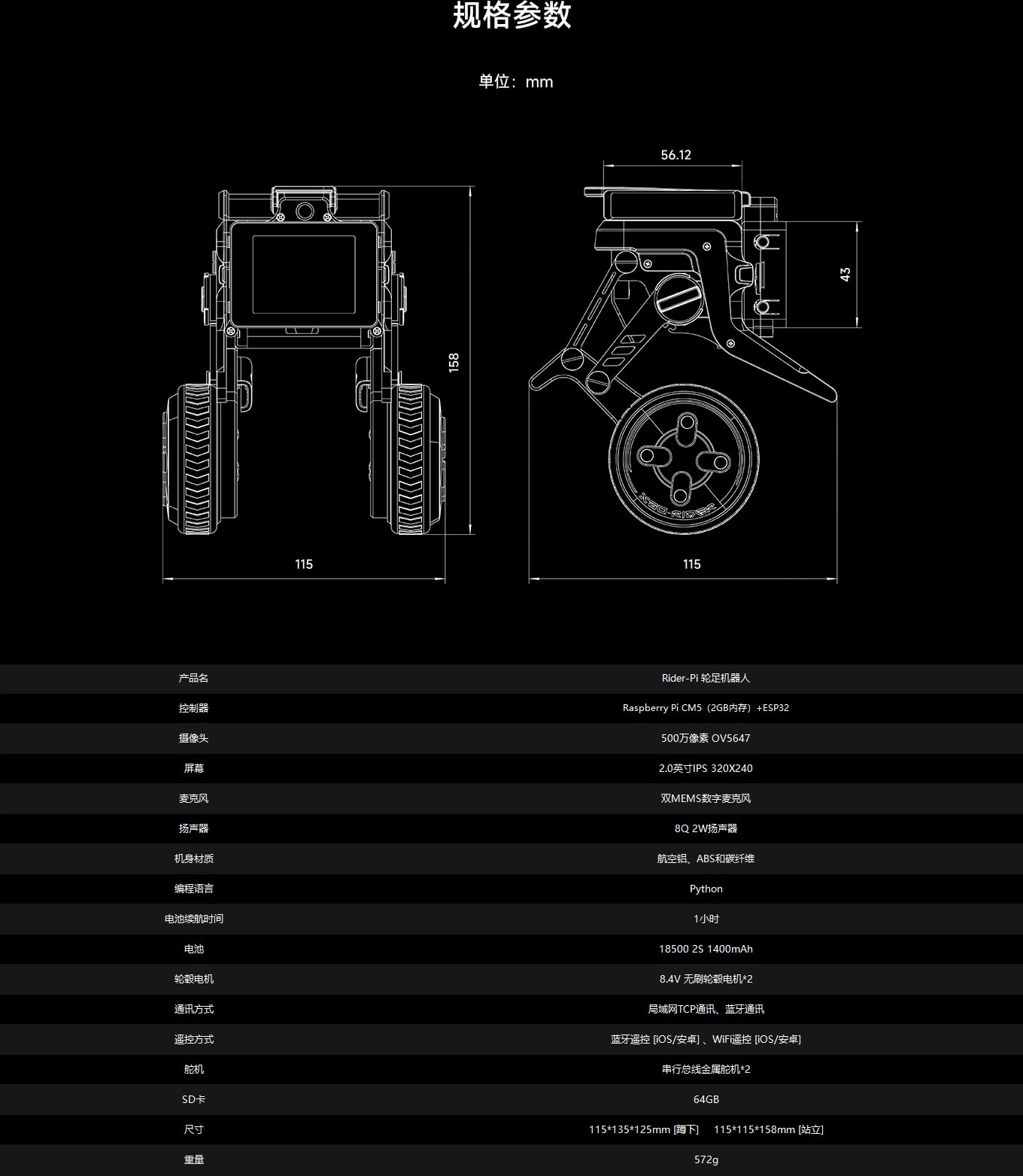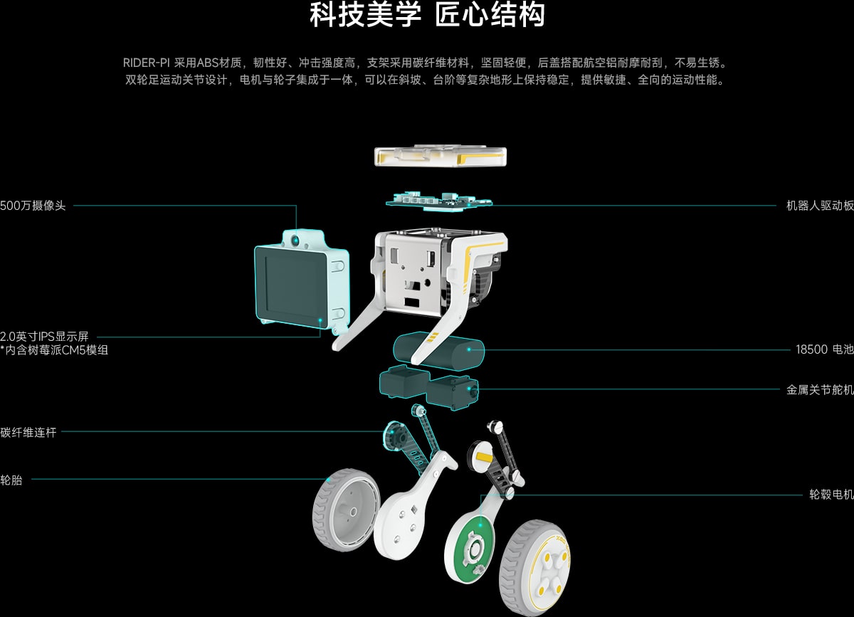 Rider-Pi采用连杆式结构,配备双轮足运动关节和一体式轮毂电机,可以在斜坡、台阶等复杂地形上保持稳定,提供敏捷、全向的运动性能。