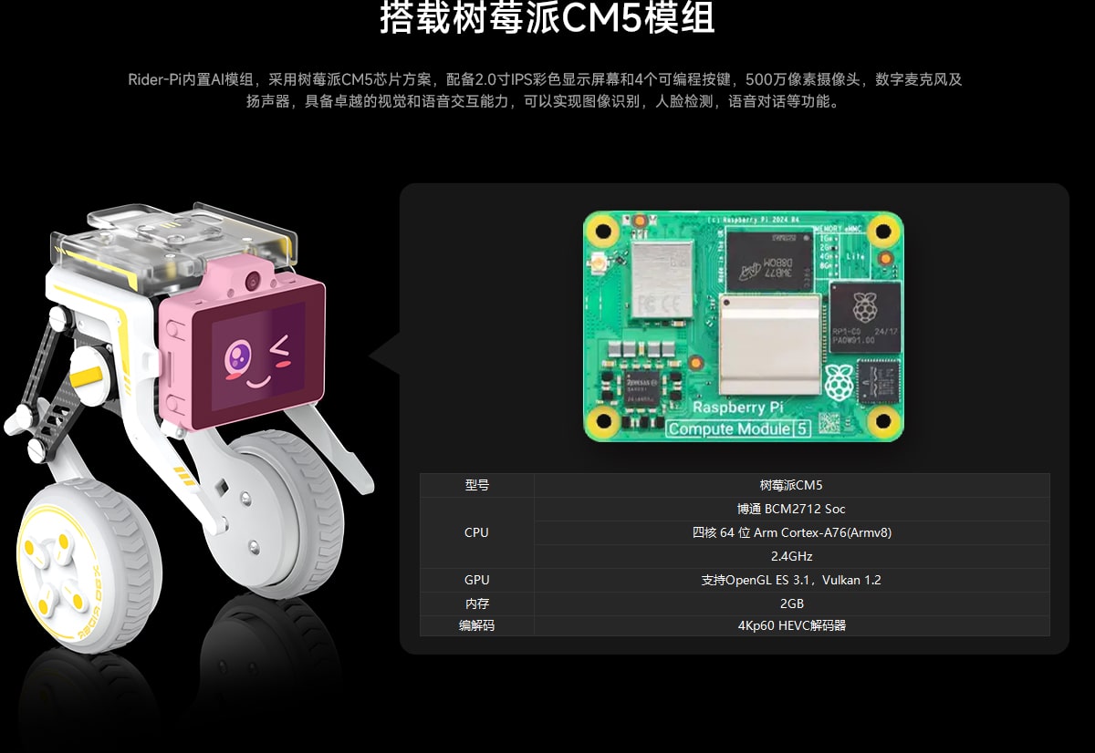 Rider-Pi配备了500万像素摄像头、双MEMS数字麦克风和扬声器,搭载讯飞星火大模型,提供了丰富的图像和语音交互功能,能够实现图像识别、语音识别和自然语言处理,为用户带来更加智能的互动体验。