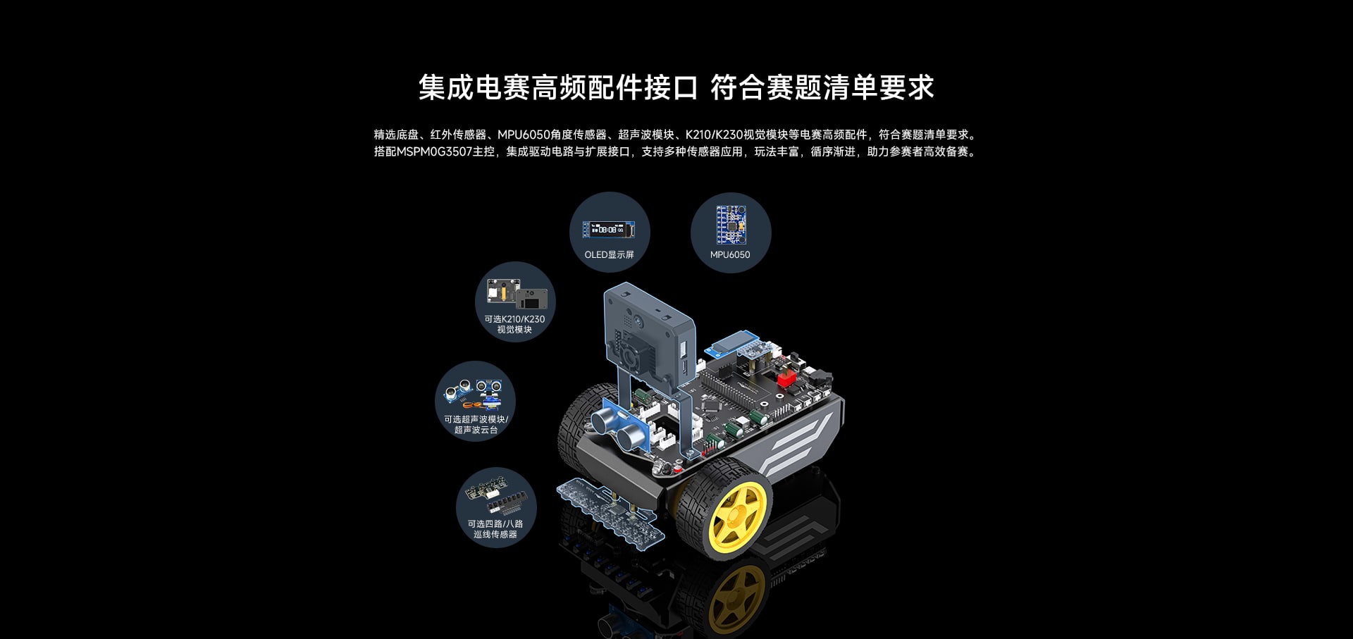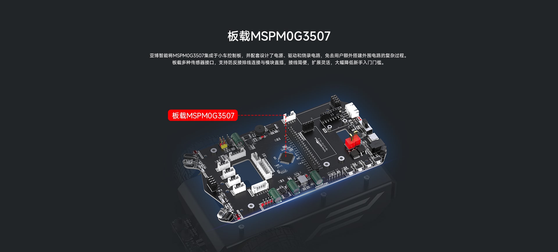 亚博智能将MSPM0G3507集成于小车控制板,并配套设计了电源、驱动和烧录电路,免去用户额外搭建外围电路的复杂过程。板载多种传感器接口,支持防反接排线连接与模块直插,接线简便,扩展灵活,大幅降低新手入门门槛