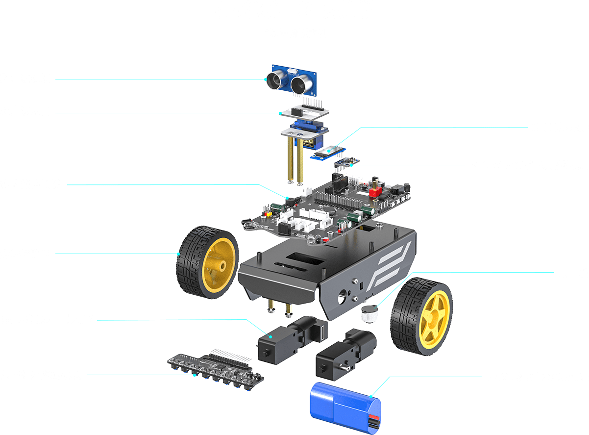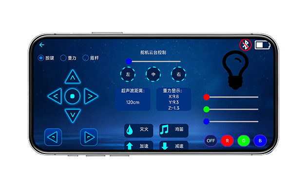 小车预留蓝牙接口,支持蓝牙5.0,配套专属APP,可通过手机控制小车运动、灯光、鸣笛及巡线、避障、跟随、寻光等功能。